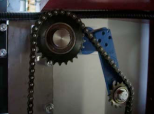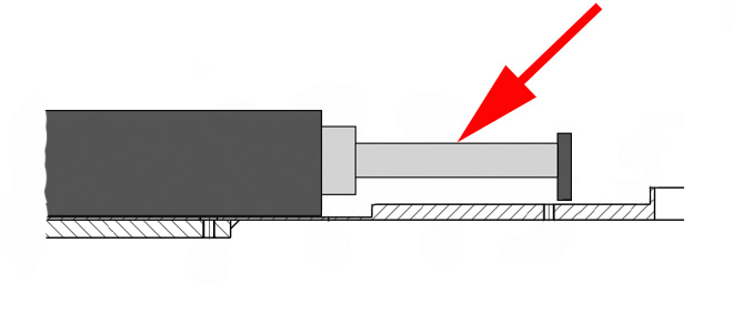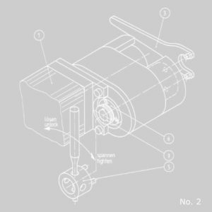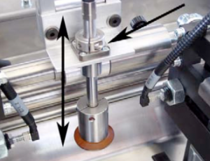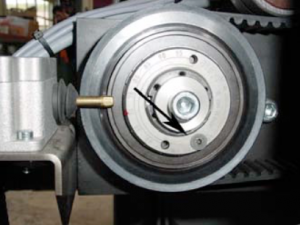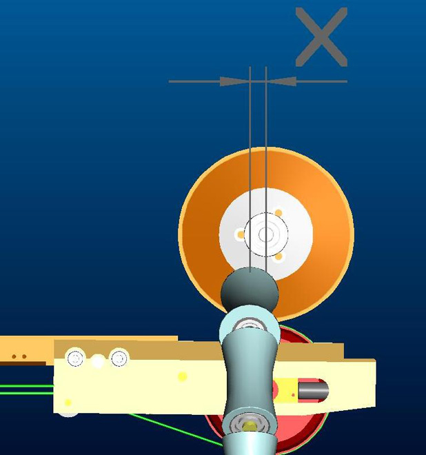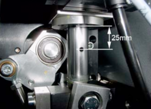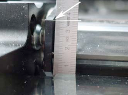 Then you loosen the M6 counternut (1) below the plate, then you can adjust the position with the M6 screw (2). When you turn clockwise, you will reduce the distance, when you turn counterclockwise you increase the distance between the calibration crown and the pendulum roller head.
