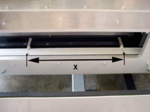 First operation feeds the stripes too early into the upper magnetic belt of 2. table. Therefore the stripes do not stop on the upper magnetic belt and will be ejected through the slot in the frame of the 2. table.
