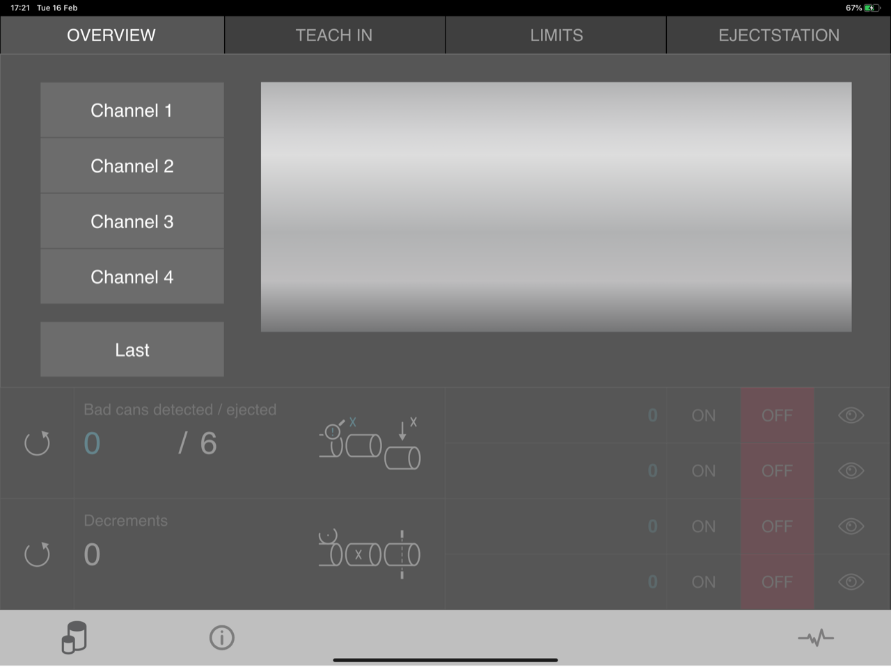 The decrement counter shows the number of cans between the welding station and first light barrier of the eject station. If the value is wrong, the ejection of cans is out of sync with the faulty products.
